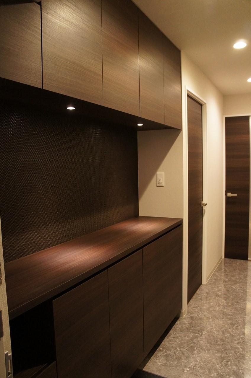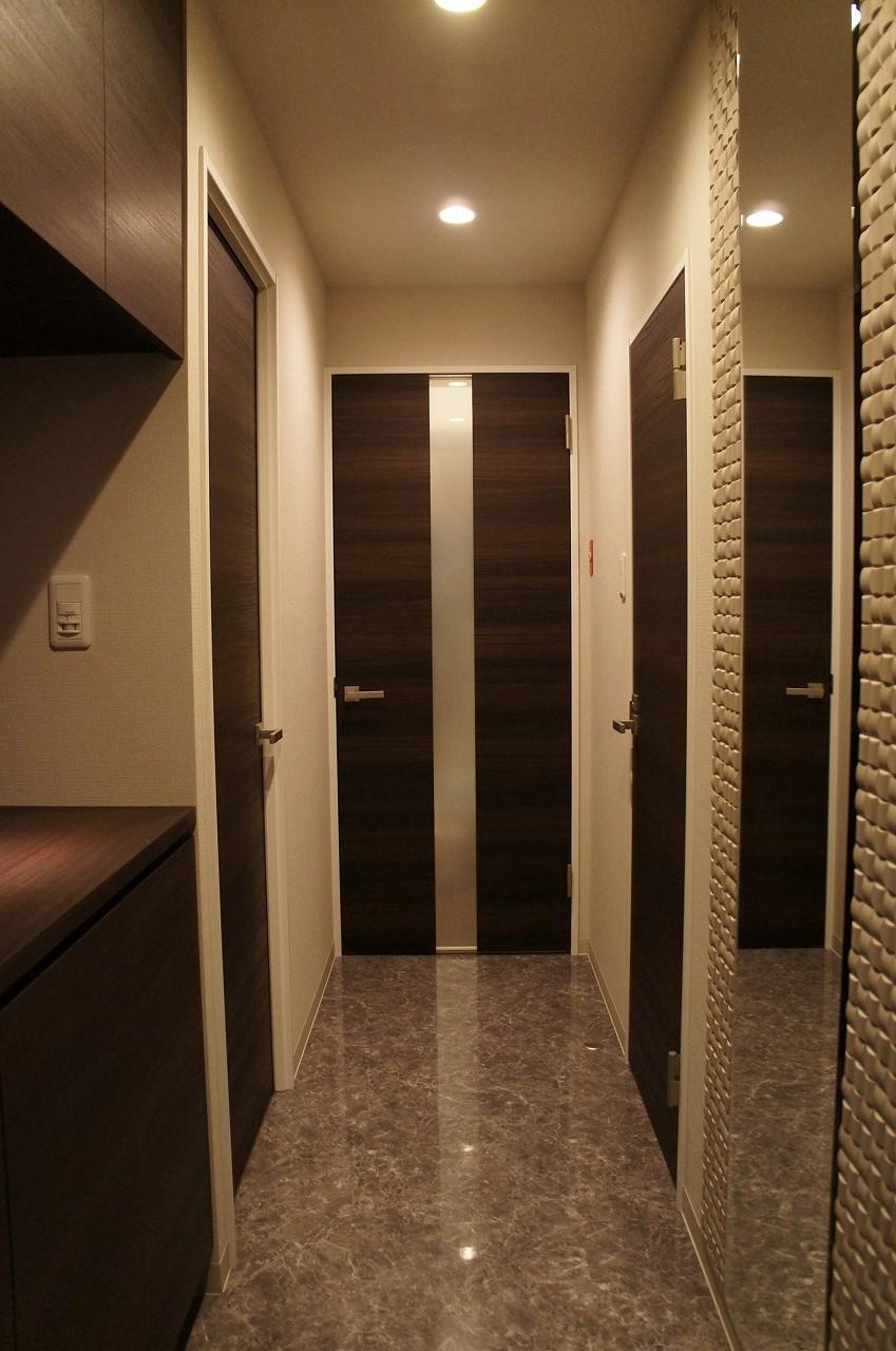 玄関の床は大理石調のタイルです。玄関壁にはタイルと鏡で豪華さを演出