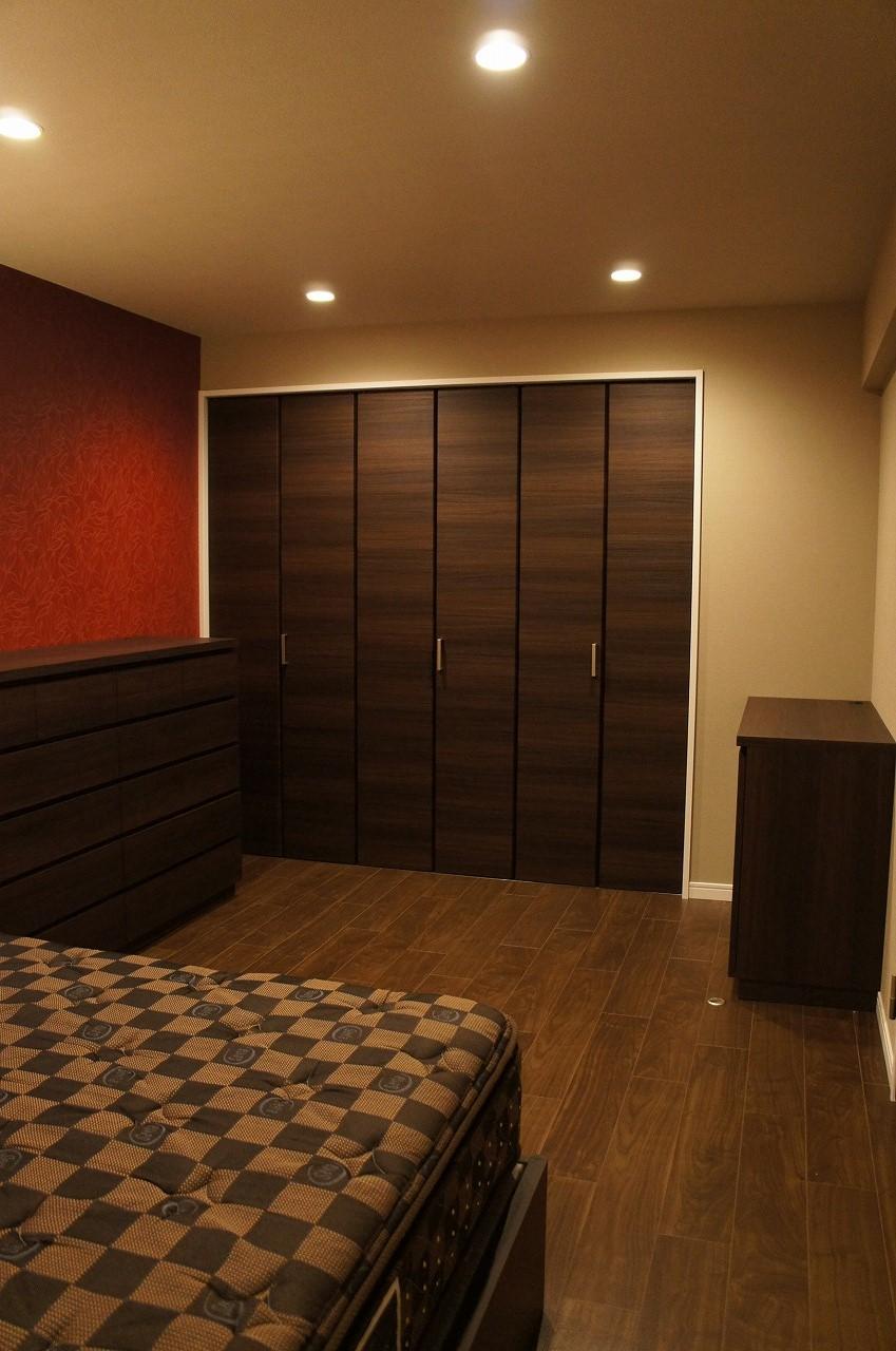 主寝室もダウンライトで演出。アクセントクロスは【赤】チェストは2台造作で製作。